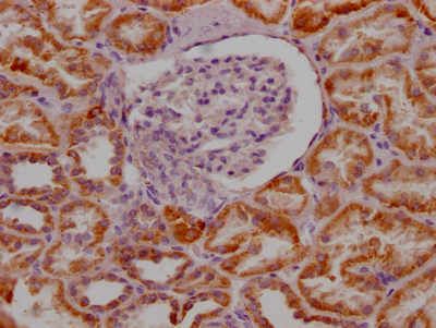 IHC image of CSB-RA250615A0HU diluted at 1:100 and staining in paraffin-embedded human kidney tissue performed on a Leica BondTM system. After dewaxing and hydration, antigen retrieval was mediated by high pressure in a citrate buffer (pH 6.0). Section was blocked with 10% normal goat serum 30min at RT. Then primary antibody (1% BSA) was incubated at 4℃ overnight. The primary is detected by a Goat anti-rabbit IgG polymer labeled by HRP and visualized using 0.05% DAB.