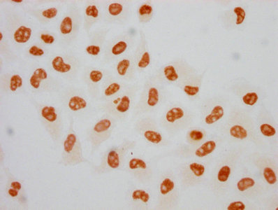 Immunocytochemistry analysis of CSB-RA018327A05phHU diluted at 1:75 and staining in Hela cells(treated with 100ng/ml EGF for 4h) performed on a Leica BondTM system. The cells were fixed in 4% formaldehyde, permeabilized using 0.2% Triton X-100 and blocked with 10% normal goat serum 30min at RT. Then primary antibody (1% BSA) was incubated at 4℃ overnight. The primary is detected by a biotinylated secondary antibody and visualized using an HRP conjugated SP system.