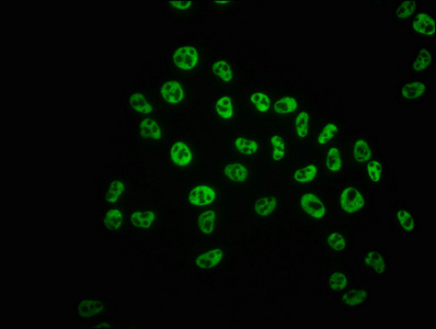 Immunofluorescence staining of Hela cells with CSB-RA018327A05phHU at 1:100,counter-stained with DAPI. The cells were fixed in 4% formaldehyde, permeabilized using 0.2% Triton X-100 and blocked in 10% normal Goat Serum. The cells were then incubated with the antibody overnight at 4℃. The secondary antibody was Alexa Fluor 488-congugated AffiniPure Goat Anti-Rabbit IgG (H+L).