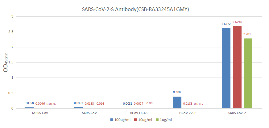ELISA: Immobilize various types of SARS proteins at concentration of 2μg/ml on solid substrate, then react with SARS-CoV-2-S Antibody at concentration of 100μg/ml, 10μg/ml and 1μg/ml. It shows the SARS-CoV-2-S Antibody (CSB-RA33245A1GMY) is specific for SARS-CoV-2-S1-RBD protein, without any cross-reactivity with MERS-CoV, SARS-CoV, HCoV-OC43 or HCoV-229E.