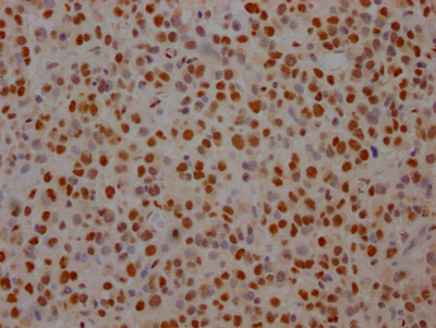 IHC image of CSB-RA102629A0HU diluted at 1:100 and staining in paraffin-embedded human glioma cancer performed on a Leica BondTM system. After dewaxing and hydration, antigen retrieval was mediated by high pressure in a citrate buffer (pH 6.0). Section was blocked with 10% normal goat serum 30min at RT. Then primary antibody (1% BSA) was incubated at 4℃ overnight. The primary is detected by a Goat anti-rabbit IgG polymer labeled by HRP and visualized using 0.05% DAB.