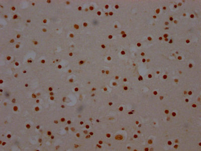 IHC image of CSB-RA102629A0HU diluted at 1:100 and staining in paraffin-embedded human brain tissue performed on a Leica BondTM system. After dewaxing and hydration, antigen retrieval was mediated by high pressure in a citrate buffer (pH 6.0). Section was blocked with 10% normal goat serum 30min at RT. Then primary antibody (1% BSA) was incubated at 4℃ overnight. The primary is detected by a Goat anti-rabbit IgG polymer labeled by HRP and visualized using 0.05% DAB.