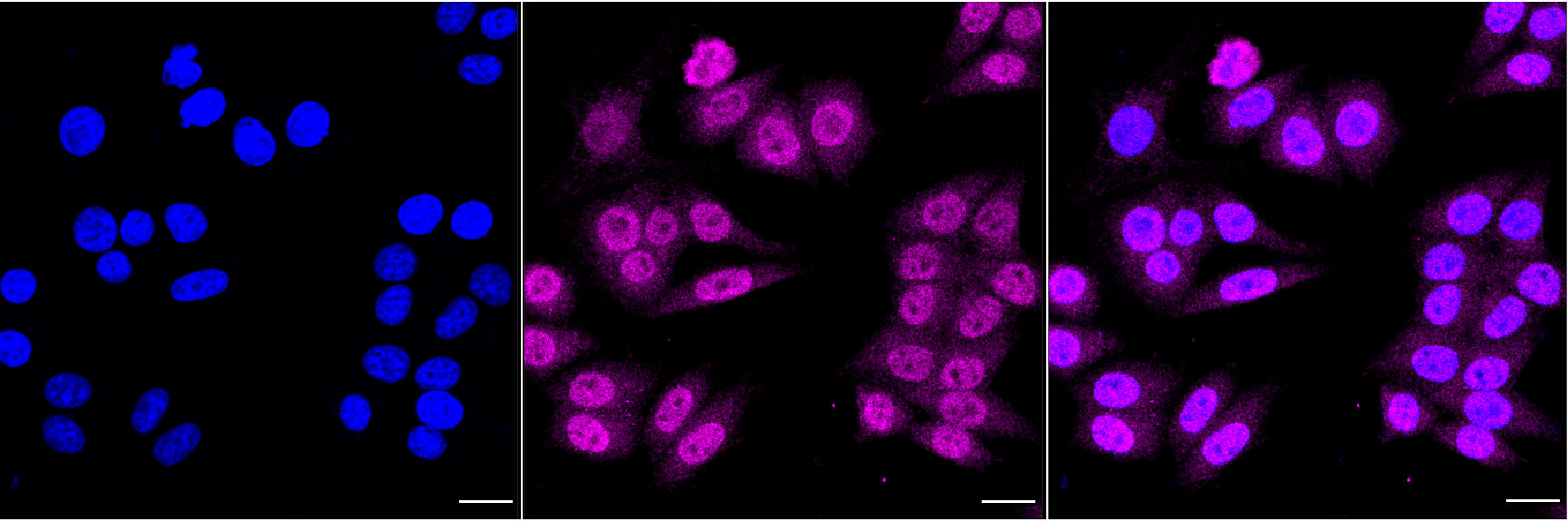 Immunocytochemical staining of HepG2 cells with SMCHD1 antibody. Nuclei were stained blue with DAPI; SMCHD1 was stained magenta with Alexa Fluor? 647. Images were taken using Leica stellaris 5. Protein abundance based on laser Intensity and smart gain: Medium. Scale bar, 20 μm.