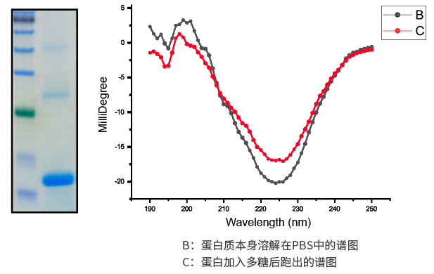 產(chǎn)品評(píng)價(jià): 本蛋白會(huì)與小分子結(jié)合,結(jié)合后構(gòu)象發(fā)生改變,通過(guò)元二色譜分析其與不加小分子的對(duì)比。黑色的曲線為蛋白質(zhì)本身溶解在PBS中在圓二色譜中跑出的譜圖,紅色為蛋白加入多糖后跑出的譜圖。因蛋白會(huì)與多糖結(jié)合,所以構(gòu)象發(fā)生變化,225nm左右值會(huì)變大。