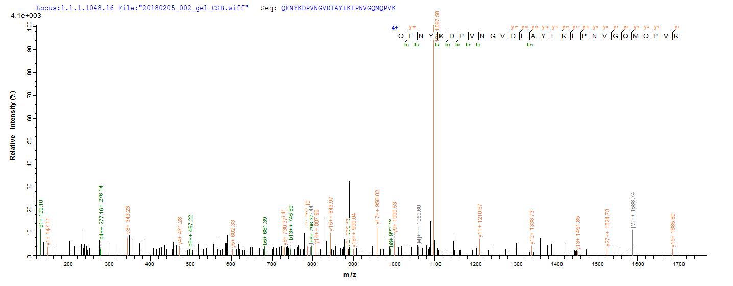 Based on the SEQUEST from database of E.coli host and target protein, the LC-MS/MS Analysis result of CSB-EP320799CLQ could indicate that this peptide derived from E.coli-expressed Clostridium botulinum botA.