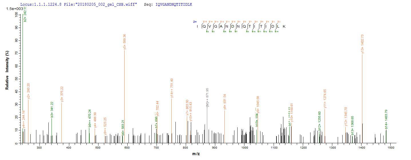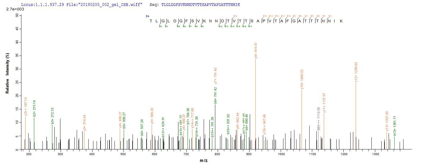 Based on the SEQUEST from database of E.coli host and target protein, the LC-MS/MS Analysis result of CSB-EP300968ENVe1 could indicate that this peptide derived from E.coli-expressed Escherichia coli (strain K12) fliC.