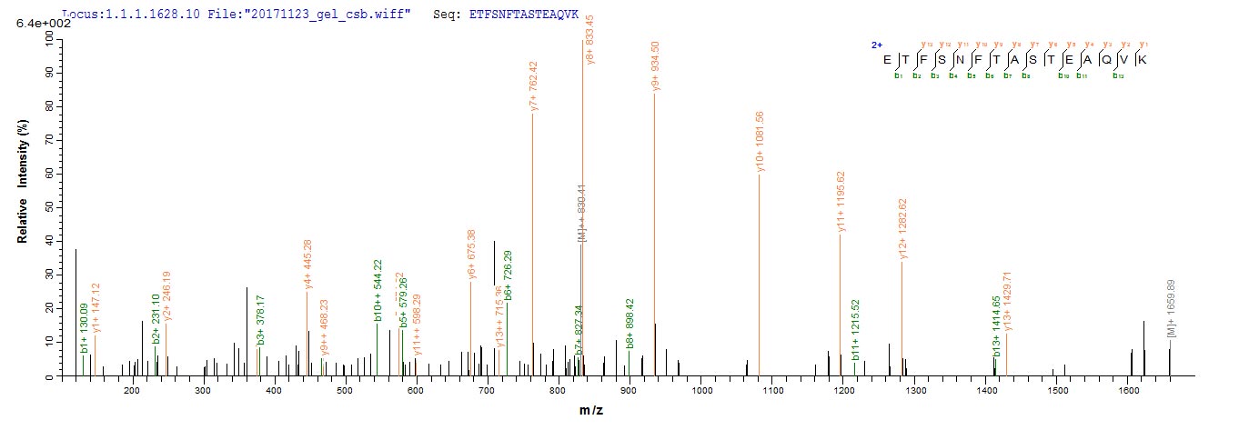 Based on the SEQUEST from database of E.coli host and target protein, the LC-MS/MS Analysis result of CSB-RP174694h could indicate that this peptide derived from E.coli-expressed Homo sapiens (Human) ASGR1.