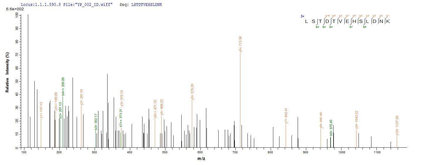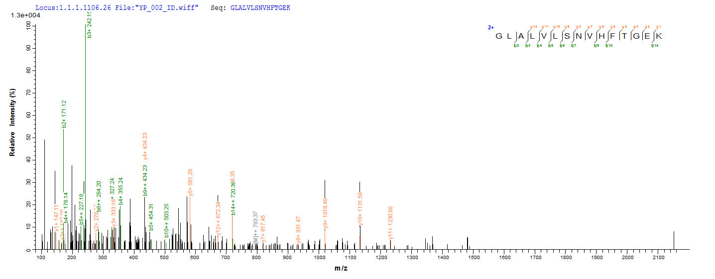 Based on the SEQUEST from database of E.coli host and target protein, the LC-MS/MS Analysis result of CSB-EP004547HU could indicate that this peptide derived from E.coli-expressed Homo sapiens (Human) CASP2.