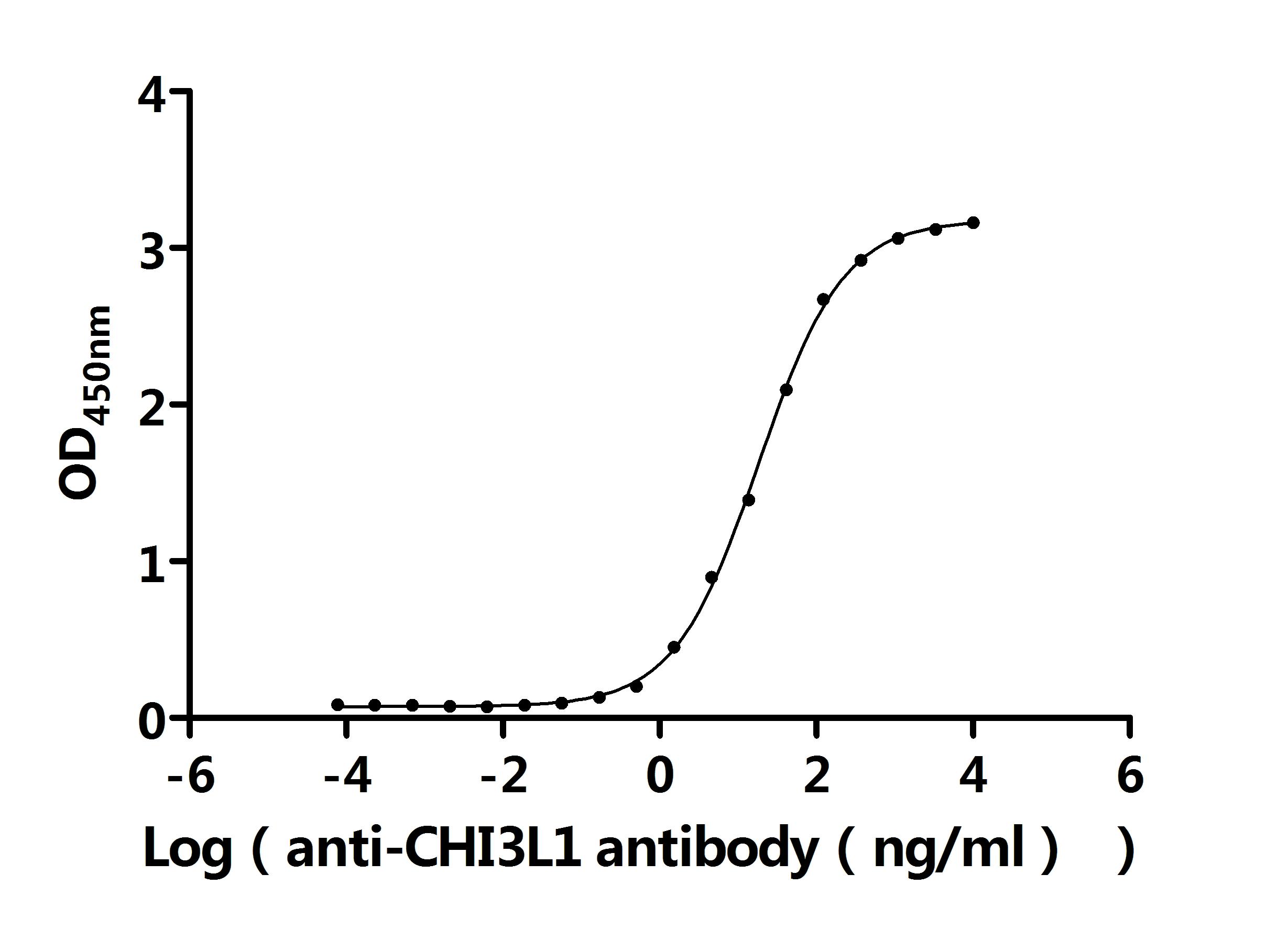 Measured by its binding ability in a functional ELISA. Immobilized Human CHI3L1 at 2 μg/ml can bind Anti-CHI3L1 recombinant antibody (CSB-RA005346MA2HU). The EC50 is 15.06-22.43 ng/mL. Biological Activity Assay -
