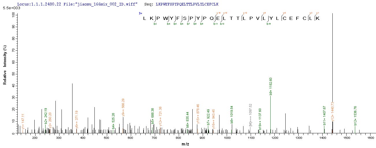Based on the SEQUEST from database of E.coli host and target protein, the LC-MS/MS Analysis result of CSB-RP178494h could indicate that this peptide derived from E.coli-expressed Homo sapiens (Human) KAT5.