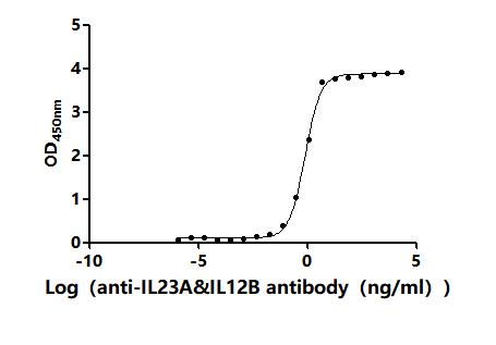 Measured by its binding ability in a functional ELISA. Immobilized Human IL23A&IL12B at 2 μg/ml can bind Anti-IL23A&IL12B recombinant antibody (CSB-RA011587MA2HU). The EC50 is 0.7293-0.8610 ng/mL. Biological Activity Assay -
