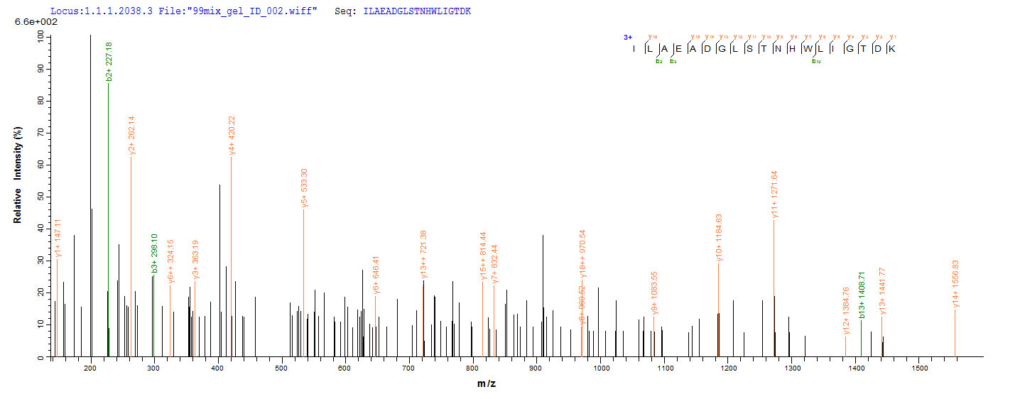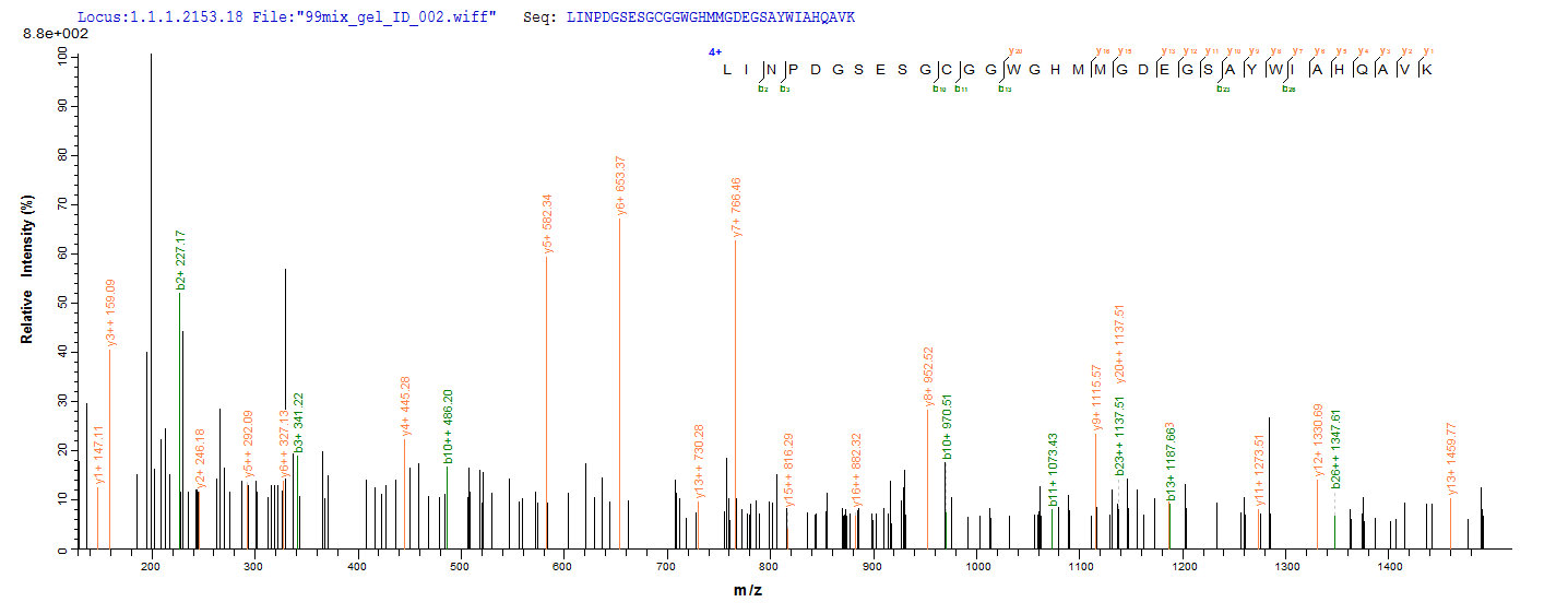 Based on the SEQUEST from database of E.coli host and target protein, the LC-MS/MS Analysis result of CSB-EP883457HU could indicate that this peptide derived from E.coli-expressed Homo sapiens (Human) NAGK.