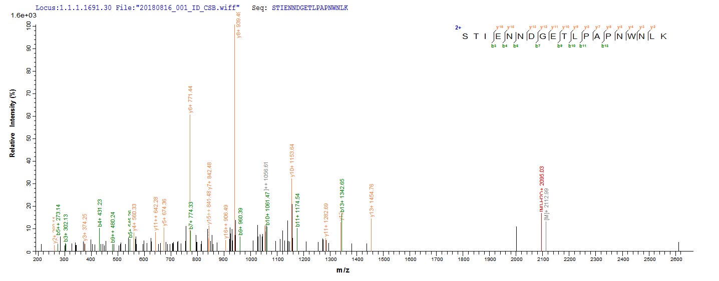 Based on the SEQUEST from database of E.coli host and target protein, the LC-MS/MS Analysis result of CSB-EP809009HU could indicate that this peptide derived from E.coli-expressed Homo sapiens (Human) FAM217A.