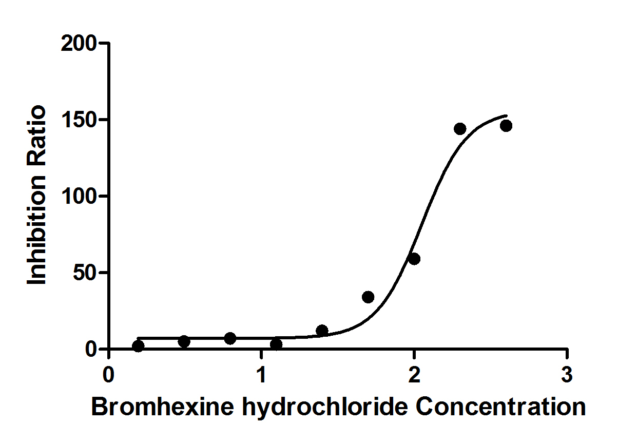 Measured by Bromhexine Hydrochloride inhibit ratio on TMPRSS2 (CSB-MP023924HU(M)b0), which can cleave fluorogenic peptide substrate (Boc-Gln-Ala-Arg-AMC). The Bromhexine Hydrochloride inhibit EC50 is 81.79-154.2μM. Biological Activity Assay -