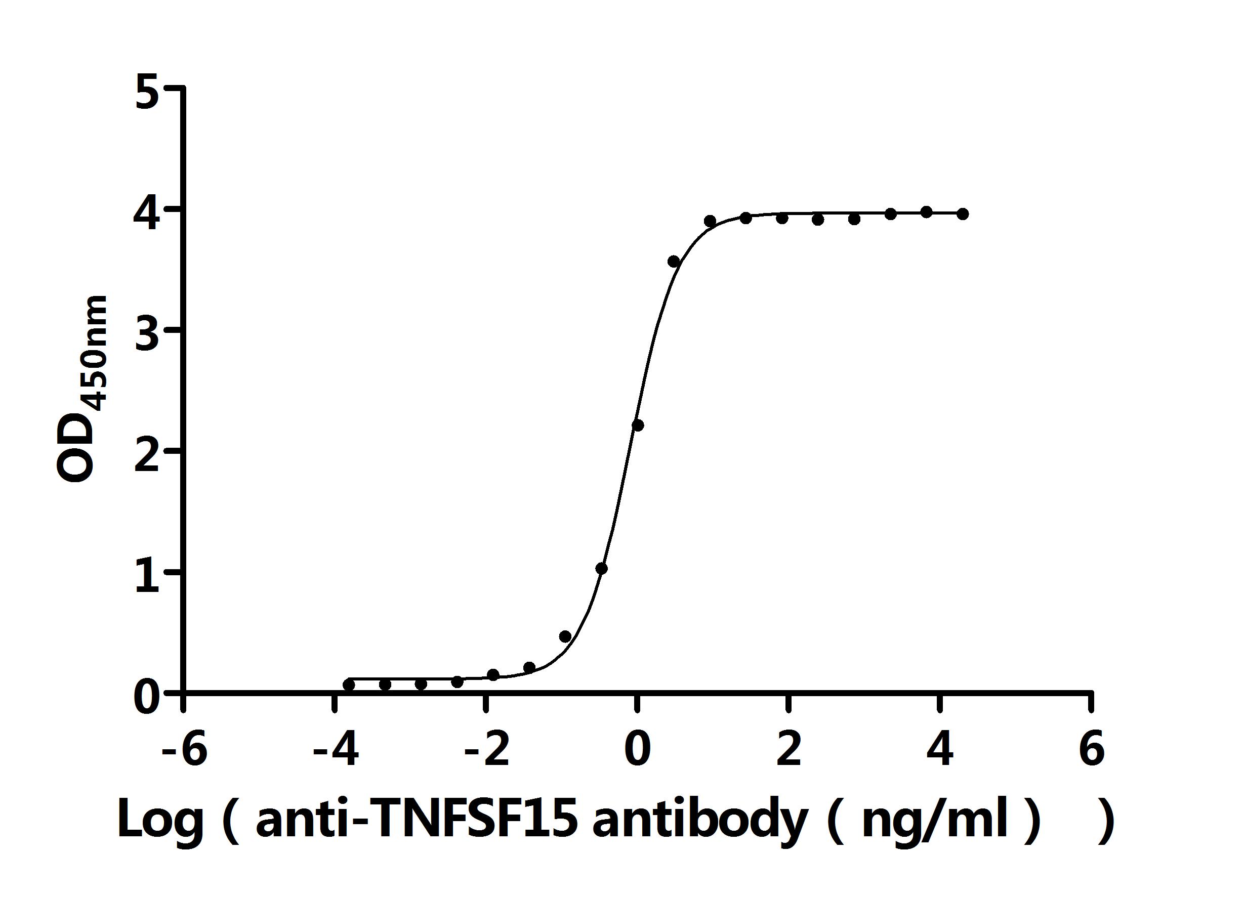 生物活性:Measured by its binding ability in a functional ELISA. Immobilized Human TNFSF15 at 2 μg/mL can bind Anti-TNFSF15 recombinant antibody (CSB-RA023992MA1HU). The EC50 is 0.7563-0.8726 ng/mL.