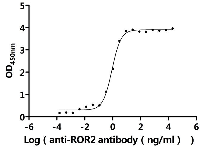 Measured by its binding ability in a functional ELISA.Immobilized Human ROR2 at 2 μg/ml can bind Anti-ROR2 recombinant antibody (CSB-RA932279MA2HU).The EC50 is 0.8067-0.9971 ng/mL. Biological Activity Assay -