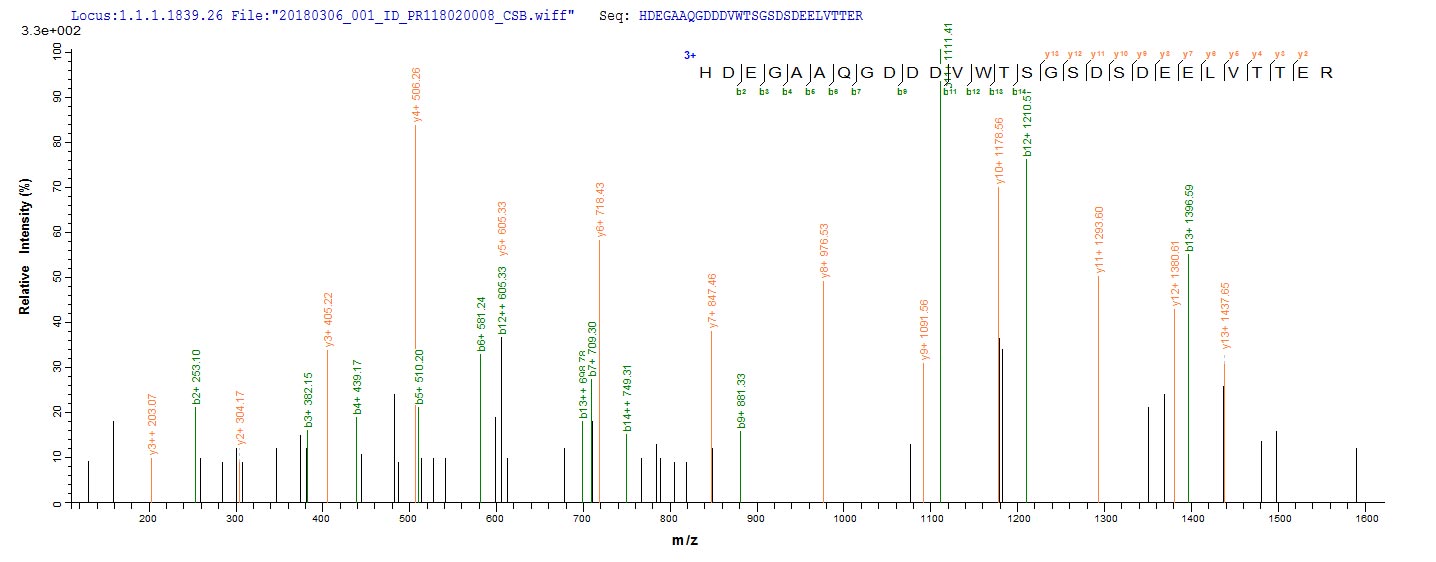 Based on the SEQUEST from database of E.coli host and target protein, the LC-MS/MS Analysis result of CSB-EP361930HWV could indicate that this peptide derived from E.coli-expressed Human cytomegalovirus (strain AD169) (HHV-5) (Human herpesvirus 5) UL83.