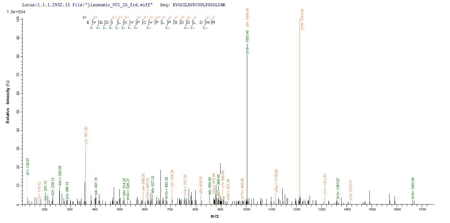 Based on the SEQUEST from database of E.coli host and target protein, the LC-MS/MS Analysis result of CSB-EP836165HSP could indicate that this peptide derived from E.coli-expressed Human herpesvirus 1 (strain KOS) (HHV-1) (Human herpes simplex virus 1) gL.