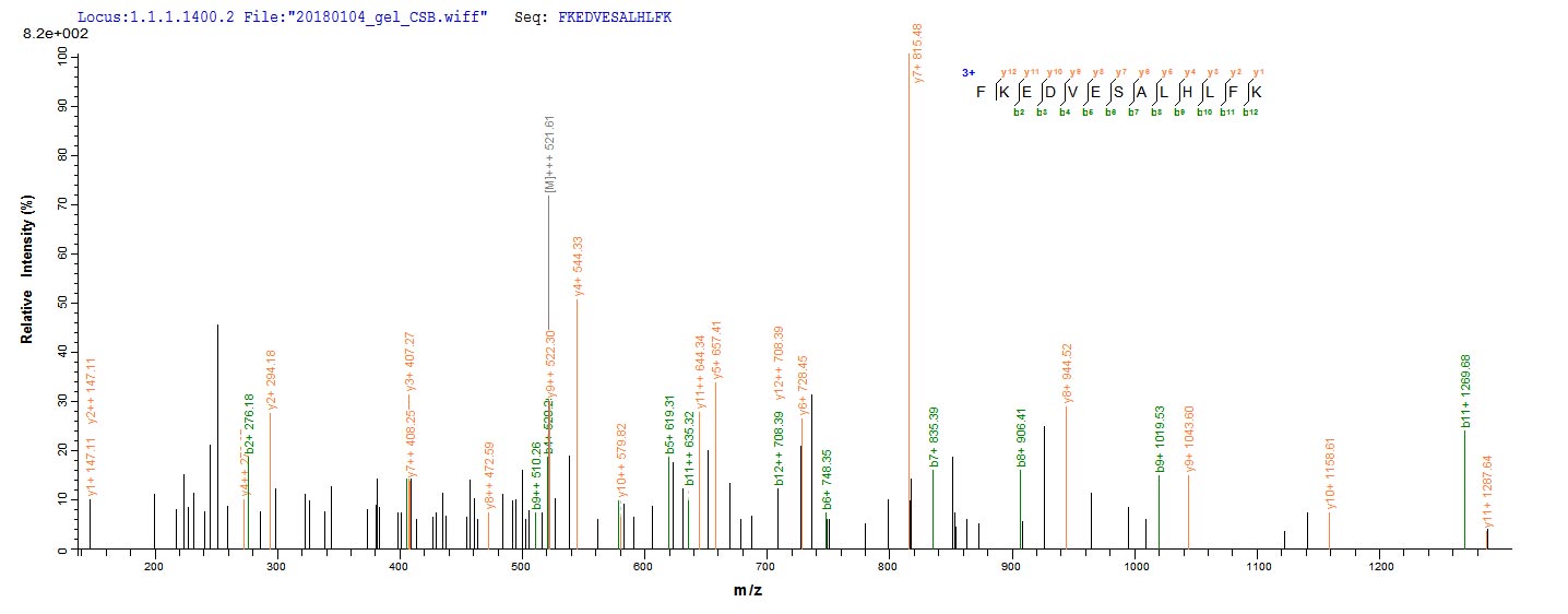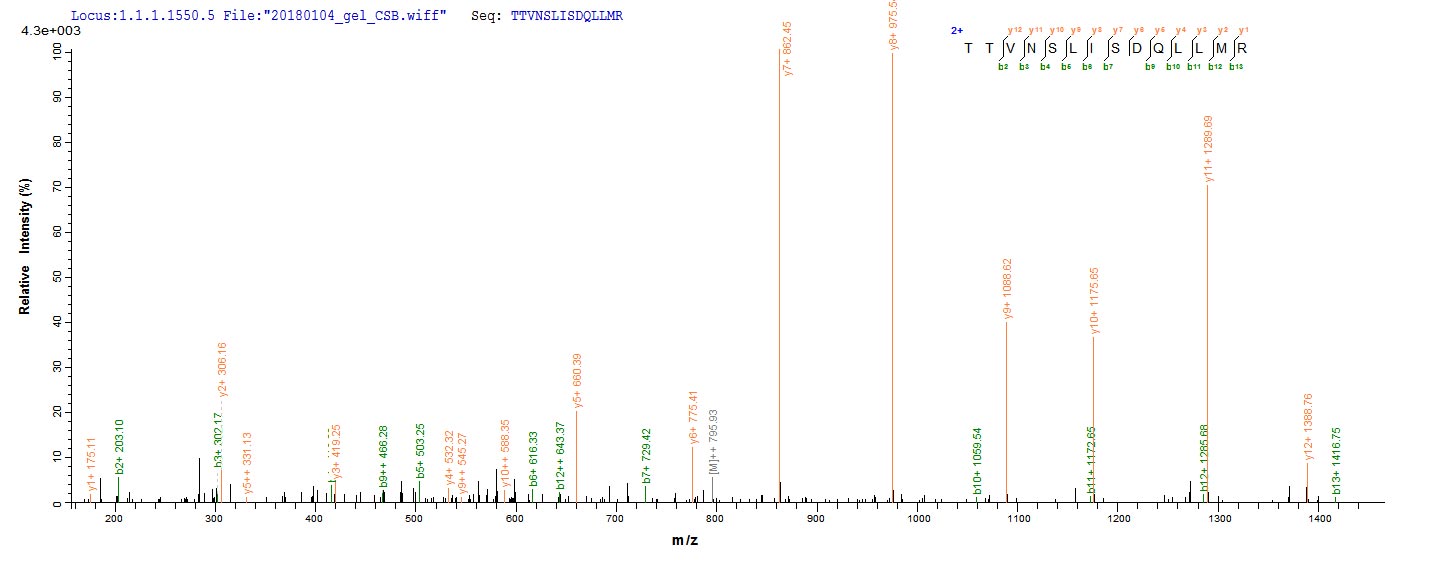 Based on the SEQUEST from database of E.coli host and target protein, the LC-MS/MS Analysis result of CSB-EP357830LKW could indicate that this peptide derived from E.coli-expressed Lymphocytic choriomeningitis virus (strain Armstrong) (LCMV) GPC.