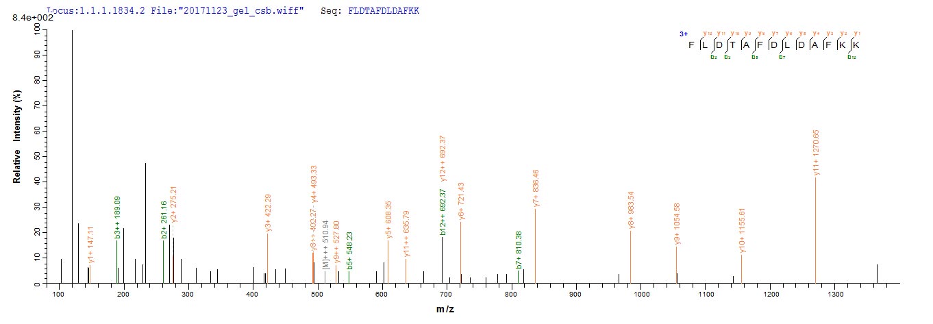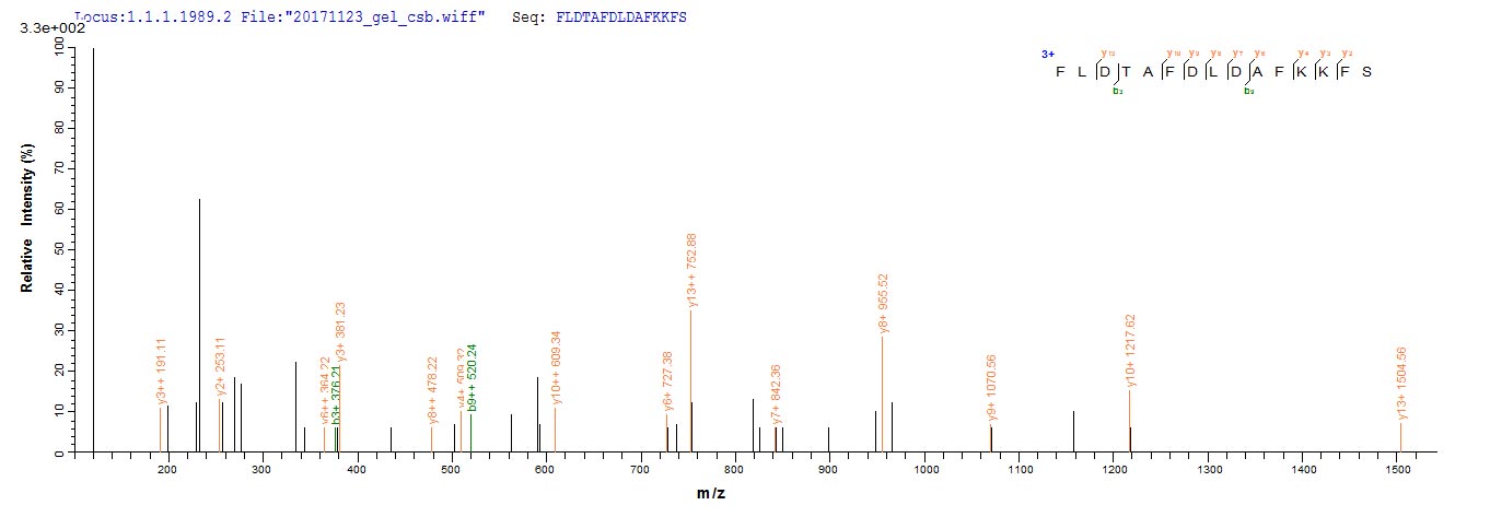 Based on the SEQUEST from database of E.coli host and target protein, the LC-MS/MS Analysis result of CSB-EP730634MO could indicate that this peptide derived from E.coli-expressed Mus musculus (Mouse) Ogdh.