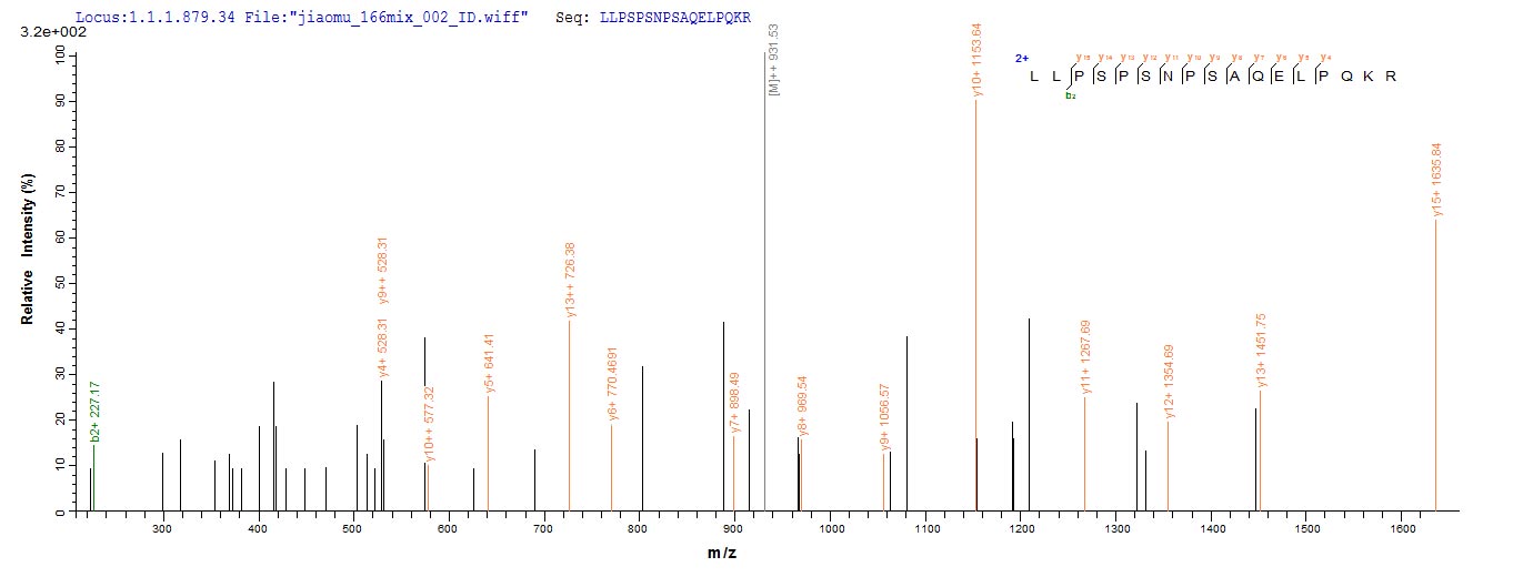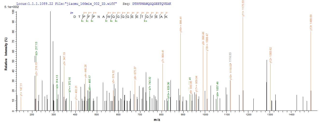 Based on the SEQUEST from database of E.coli host and target protein, the LC-MS/MS Analysis result of CSB-EP723715MO could indicate that this peptide derived from E.coli-expressed Mus musculus (Mouse) Aebp1.