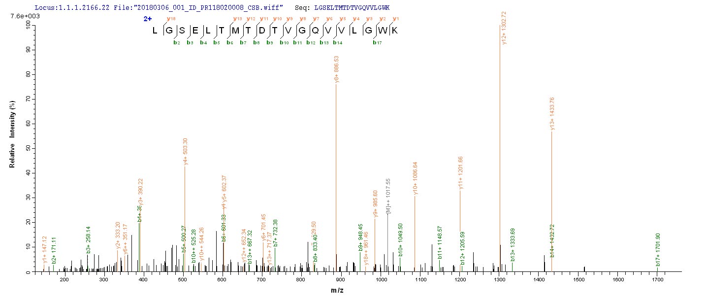 Based on the SEQUEST from database of E.coli host and target protein, the LC-MS/MS Analysis result of CSB-RP149074BA(A3) could indicate that this peptide derived from E.coli-expressed Mycobacterium tuberculosis mpt63.