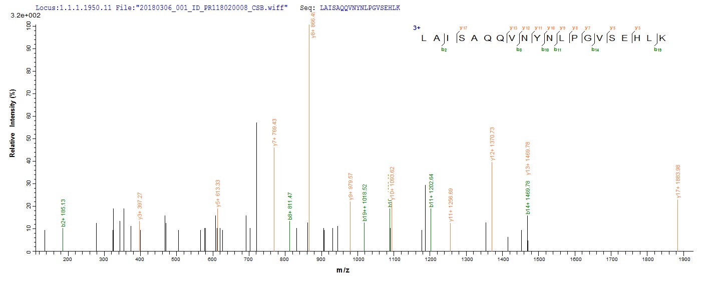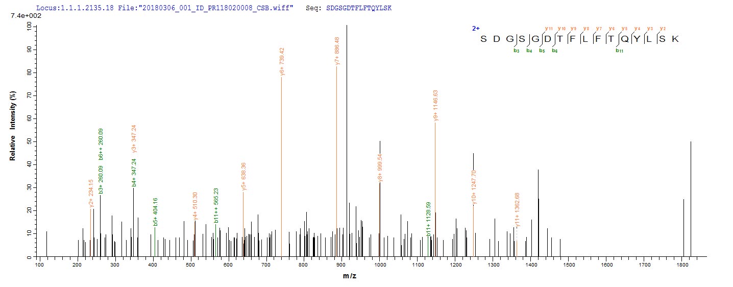 • Based on the SEQUEST from database of E.coli host and target protein, the LC-MS/MS Analysis result of CSB-RP149194BA could indicate that this peptide derived from E.coli-expressed Homo sapiens (Human) pstS1.