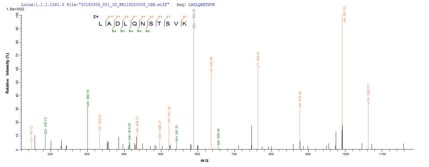 Based on the SEQUEST from database of E.coli host and target protein, the LC-MS/MS Analysis result of CSB-EP302719MLW could indicate that this peptide derived from E.coli-expressed Mycoplasma pneumoniae (strain ATCC 29342 / M129) pepA.