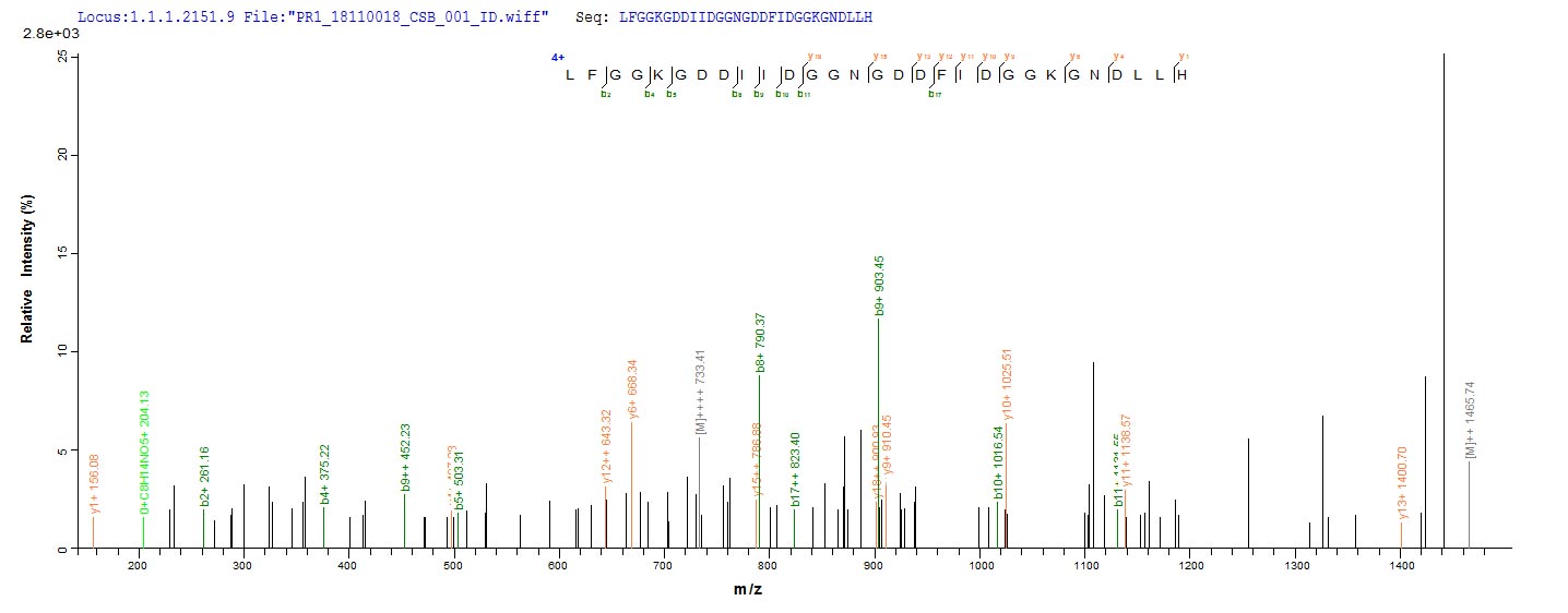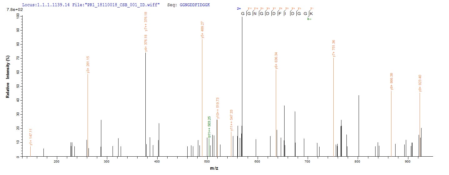 Based on the SEQUEST from database of E.coli host and target protein, the LC-MS/MS Analysis result of CSB-EP314743ESE could indicate that this peptide derived from E.coli-expressed Mannheimia haemolytica (Pasteurella haemolytica) lktA.