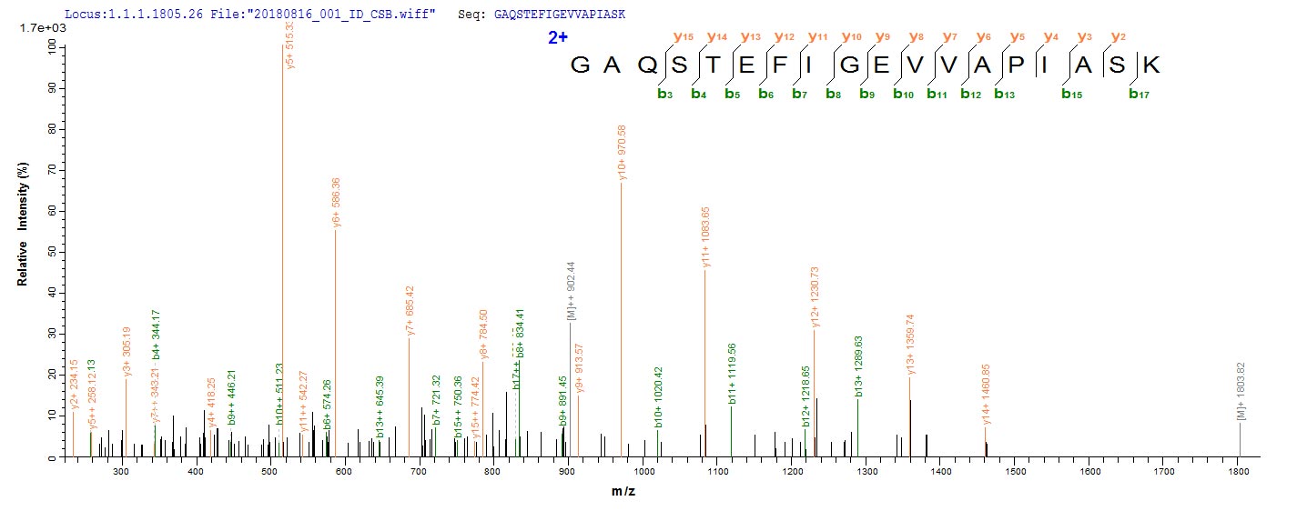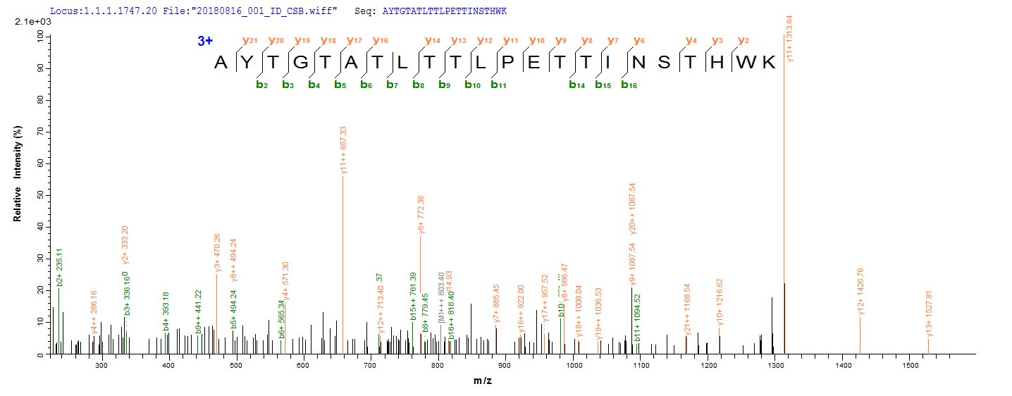 Based on the SEQUEST from database of E.coli host and target protein, the LC-MS/MS Analysis result of CSB-EP312474EUK could indicate that this peptide derived from E.coli-expressed Phanerochaete chrysosporium (White-rot fungus) (Sporotrichum pruinosum) CDH-1.