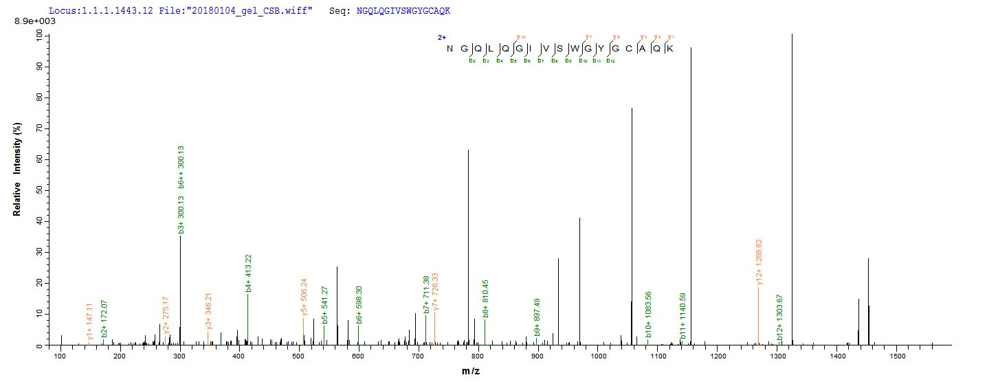 Based on the SEQUEST from database of Yeast host and target protein, the LC-MS/MS Analysis result of CSB-YP018814PI could indicate that this peptide derived from Yeast-expressed Sus scrofa (Pig) N/A.