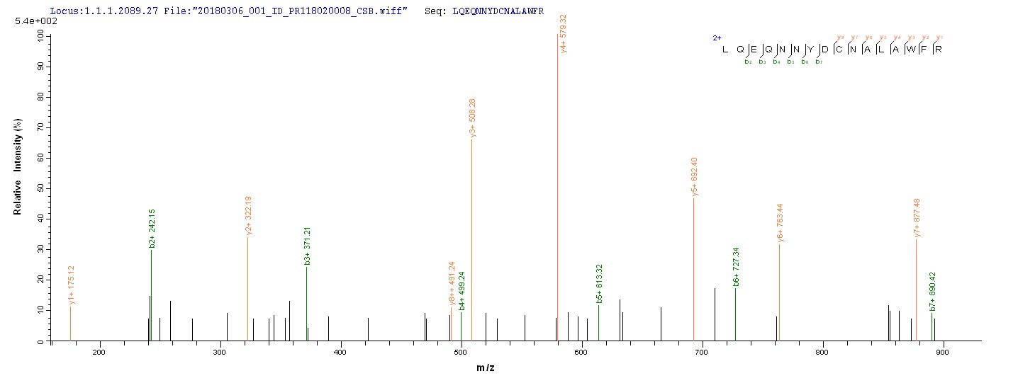 Based on the SEQUEST from database of E.coli host and target protein, the LC-MS/MS Analysis result of CSB-EP361746EZX could indicate that this peptide derived from E.coli-expressed Pseudomonas aeruginosa (strain ATCC 15692 / DSM 22644 / CIP 104116 / JCM 14847 / LMG) plcH.