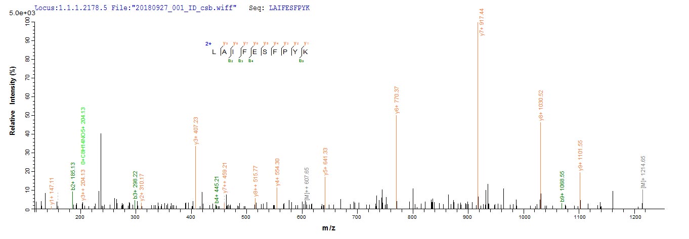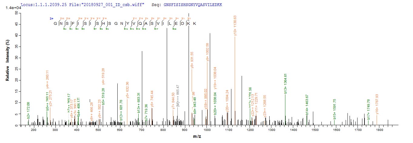 Based on the SEQUEST from database of Baculovirus host and target protein, the LC-MS/MS Analysis result of CSB-BP669769SBAF could indicate that this peptide derived from Baculovirus-expressed Streptococcus pyogenes serotype M28 (strain MGAS6180) acpS.