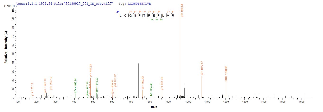 Based on the SEQUEST from database of Yeast host and target protein, the LC-MS/MS Analysis result of CSB-YP347478THA could indicate that this peptide derived from Yeast-expressed Toxocara canis (Canine roundworm) TES-26.