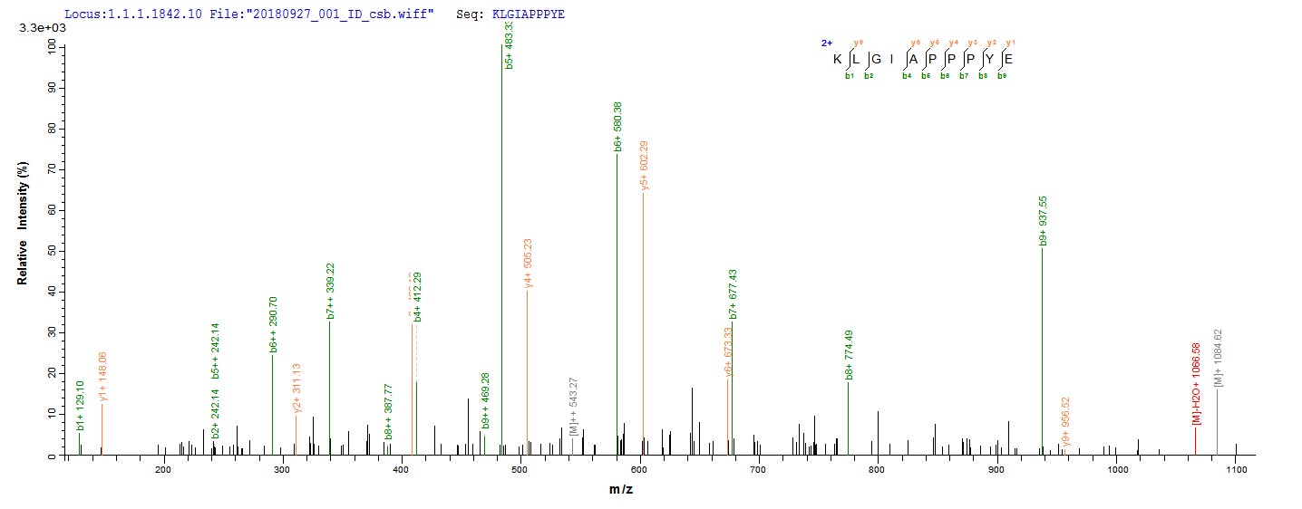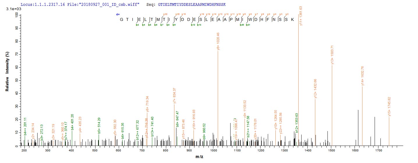 Based on the SEQUEST from database of Baculovirus host and target protein, the LC-MS/MS Analysis result of CSB-BP356390VBG could indicate that this peptide derived from Baculovirus-expressed Human adenovirus C serotype 5 (HAdV-5) (Human adenovirus 5) DBP.