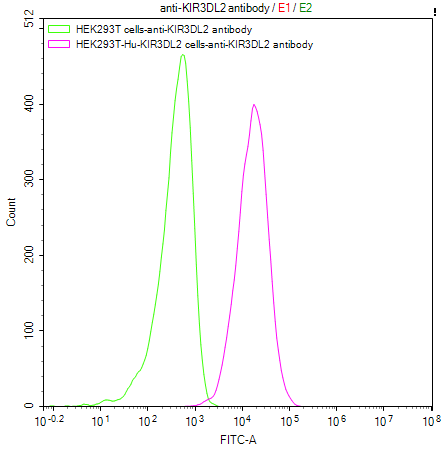 • Untransfected HEK-293T cells (green line) and transfected Human KIR3DL2 HEK-293T stable cells (red line) were stained with anti-KIR3DL2 antibody(CSB-RA012365MA1HU)(2μg/1*106cells), washed and then followed by FITC conjugated anti-Human IgG Fc antibody and analyzed with flow cytometry.