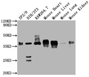 Positive WB detected in: SP2/0 whole cell lysate, NIH/3T3 whole cell lysate, Raw264.7 whole cell lysate, Mouse Heart tissue, Mouse lung tissue,Mouse kidney tissue
