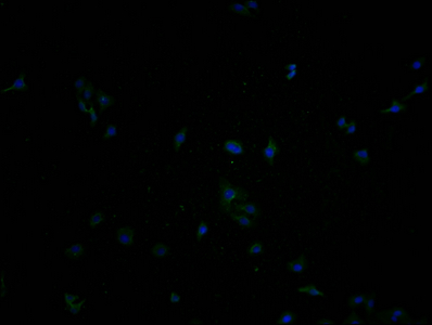 • Immunofluorescence staining of Hela cells with (CSB-MA000071M2m)at 1:50, counter-stained with DAPI. The cells were fixed in 4% formaldehyde, permeabilized using 0.2% Triton X-100 and blocked in 10% normal Goat Serum. The cells were then incubated with the antibody overnight at 4°C. Nuclear DNA was labeled in blue with DAPI. The secondary antibody was FITC-conjugated AffiniPure Goat Anti-Mouse IgG (H+L).