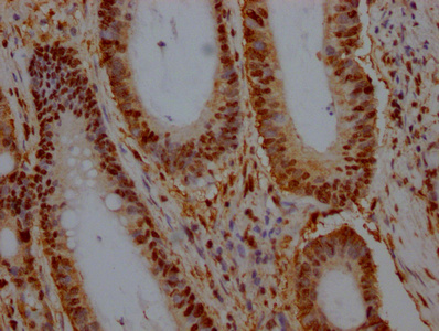 • IHC image of CSB-MA000071M2m diluted at 1:500 and staining in paraffin-embedded human colon cancer performed on a Leica BondTM system. After dewaxing and hydration, antigen retrieval was mediated by high pressure in a citrate buffer (pH 6.0). Section was blocked with 10% normal goat serum 30min at RT. Then primary antibody (1% BSA) was incubated at 4°C overnight. The primary is detected by a Goat anti-rabbit polymer IgG labeled by HRP and visualized using 0.05% DAB.