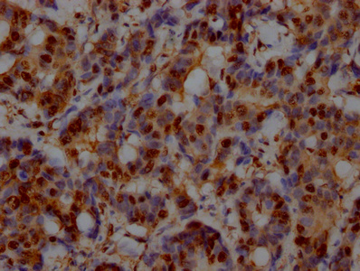 • IHC image of CSB-MA000071M2m diluted at 1:500 and staining in paraffin-embedded human breast cancer performed on a Leica BondTM system. After dewaxing and hydration, antigen retrieval was mediated by high pressure in a citrate buffer (pH 6.0). Section was blocked with 10% normal goat serum 30min at RT. Then primary antibody (1% BSA) was incubated at 4°C overnight. The primary is detected by a Goat anti-rabbit polymer IgG labeled by HRP and visualized using 0.05% DAB.