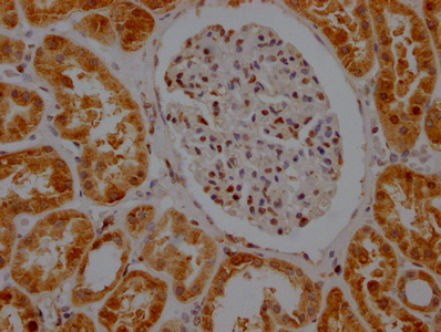 • IHC image of CSB-MA000071M2m diluted at 1:500 and staining in paraffin-embedded human kidney tissue performed on a Leica BondTM system. After dewaxing and hydration, antigen retrieval was mediated by high pressure in a citrate buffer (pH 6.0). Section was blocked with 10% normal goat serum 30min at RT. Then primary antibody (1% BSA) was incubated at 4°C overnight. The primary is detected by a Goat anti-rabbit polymer IgG labeled by HRP and visualized using 0.05% DAB.