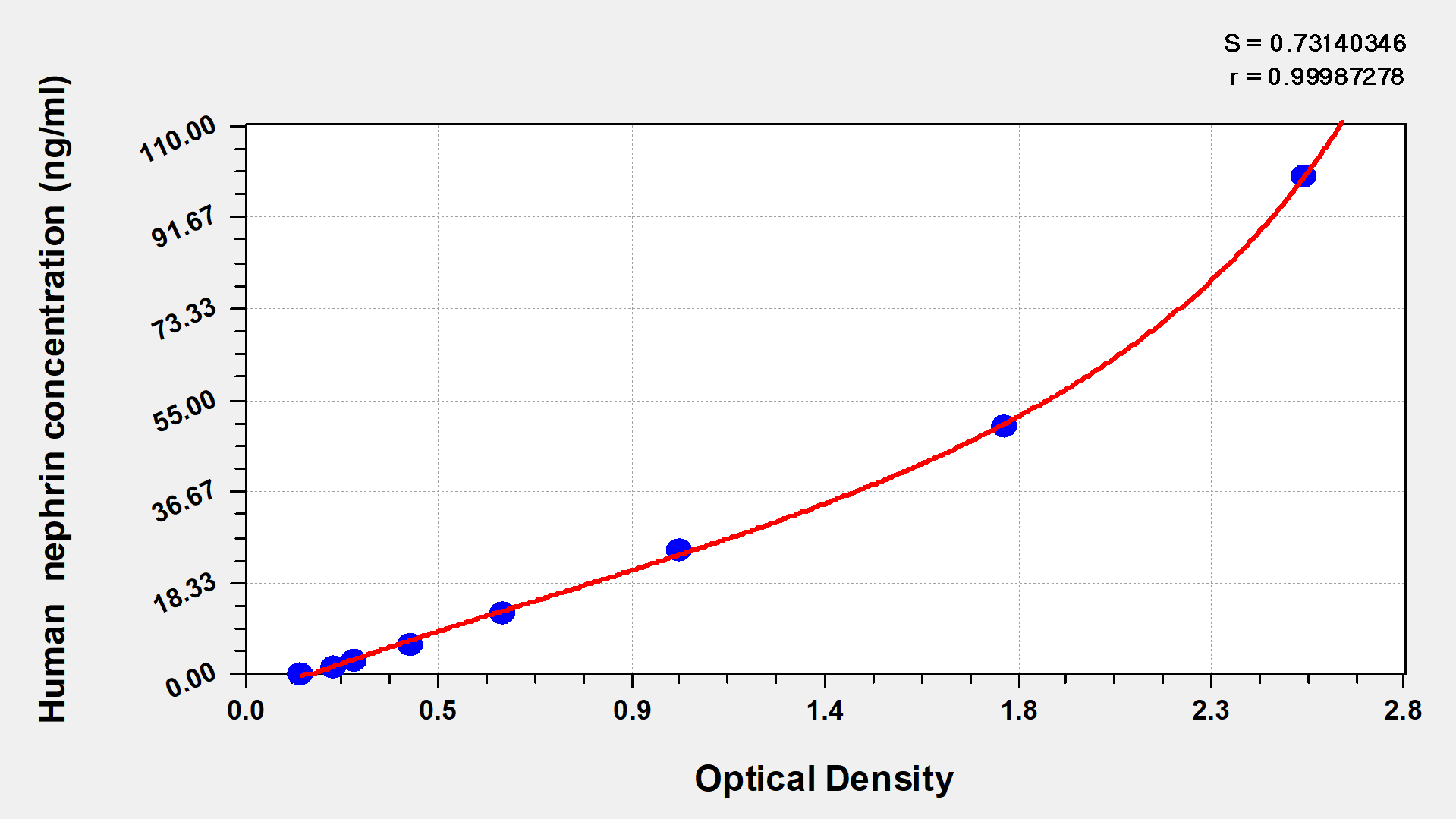 通過線性范圍來計算出實際的檢測樣本值,定量試劑盒標準曲線的相關系數R大于0.99。以CSB-E07270h(人脂聯素(ADP)ELISA Kit)為例的標準曲線。