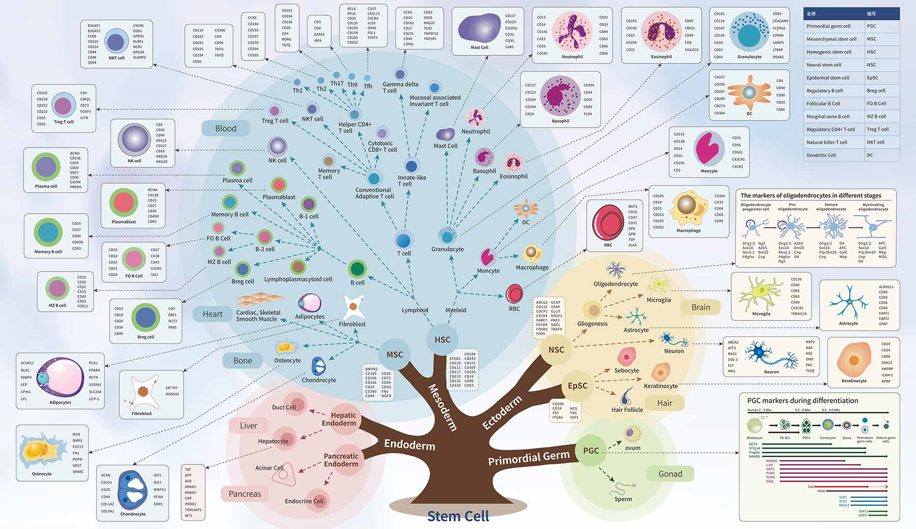 所有細(xì)胞都表達(dá)具有特征性的標(biāo)記物,可以用來(lái)區(qū)分它們與其他細(xì)胞類(lèi)型,例如蛋白質(zhì)、脂質(zhì)和糖基化。細(xì)胞標(biāo)記物可以在細(xì)胞表面以細(xì)胞外分子的形式表達(dá),也可以作為細(xì)胞內(nèi)分子在細(xì)胞內(nèi)部表達(dá)。本文涵蓋了各種細(xì)胞類(lèi)型的表面和細(xì)胞內(nèi)細(xì)胞標(biāo)記物,包括免疫細(xì)胞、干細(xì)胞、中樞神經(jīng)系統(tǒng)細(xì)胞等。