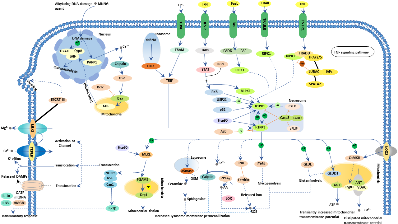 Necroptosis主要是由三個蛋白質復合物(necrosome)介導的:Receptor-interacting protein kinase 1 (RIPK1)、RIPK3和Mixed lineage kinase domain-like protein (MLKL)。 當其他死亡信號通路受阻時,例如凋亡途徑因缺乏協同作用而無法發揮作用時,細胞啟動Necroptosis。這個過程涉及到這些復合物的相互作用和激活,最終導致了細胞膜的破裂和溶膠內酶的釋放,從而導致細胞死亡。