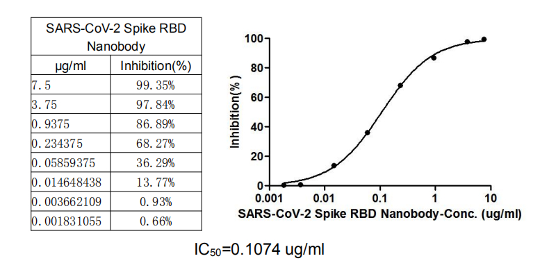 The inhibition efficacy of the SARS-CoV-2-S1-RBD /ACE2 binding was positively proportionally to this Nanobody concentrations. It showed that this Nanobody effectively inhibited the SARS-CoV-2-S1-RBD/ACE2 binding. And the IC50 of this Nanobody is 0.1074 μg/ml.