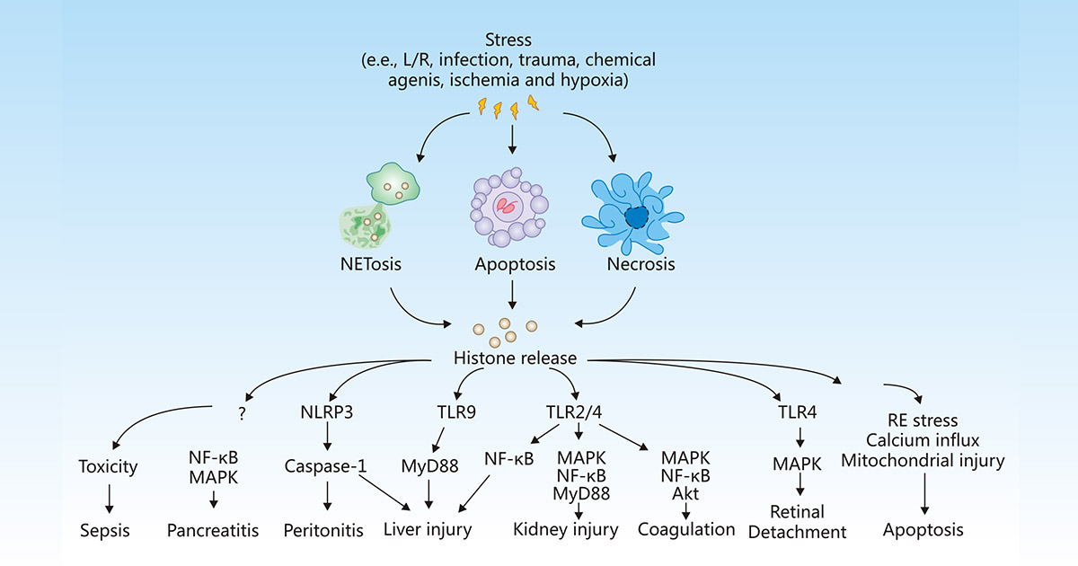 組蛋白是真核染色質的基本結構蛋白。然而,在炎癥、感染、缺血、缺氧等應激條件下,細胞可能發生凋亡、壞死或NETosis,從而導致組蛋白釋放到細胞外空間,組蛋白可激活免疫和炎癥反應,引發或加重組織損傷,或介導各種疾病的發生和發展,包括敗血癥、胰腺炎、腹膜炎、肝損傷、腎損傷、凝血、脫落和細胞凋亡等