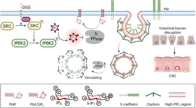 2025年9月2日,南方科技大學饒楓團隊在《Nature Chemical Biology》發表研究,揭示IP6K2及其產物5-IP7在炎癥性結直腸癌中的作用機制。研究發現,IP6K2在結直腸癌組織中高表達,與患者生存率負相關。5-IP7通過抑制5-磷酸酶OCRL活性,導致PI(4,5)P2累積,促進E-鈣黏蛋白內吞,破壞腸上皮屏障,激活β-連環蛋白致癌通路。團隊還篩選出IP6K2抑制劑異鼠李素,可顯著降低結腸癌腫瘤數量和體積,為炎癥性腸癌的治療提供了新靶點和潛在藥物。