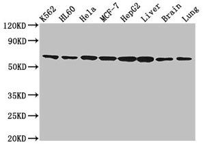 Positive WB detected in:K562 whole cell lysate,HL-60 whole cell lysate,Hela whole cell lysate, MCF-7 whole cell lysate, HepG2 whole cell lysate,Rat liver tissue, Mouse brain tissue, Mouse lung tissue