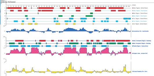 Uniprot數據庫和CBS服務器(http://www.cbs.dtu.dk/)預測信號肽、跨膜、表位等結構;EX-PASY服務器(http://www.expasy.org/tools)上的GOR4、HNN、SOPMA、nnPredict等方法。親水性、柔韌性、表面可能性、抗原表位預測、α螺旋和β折疊可以應用DNAstar軟件預測,同時可以結合Uniprot數據中的蛋白結構分析。MOE軟件也可以預測蛋白的結構,同時MOE軟件可以從多個角度分析蛋白的結構特性。